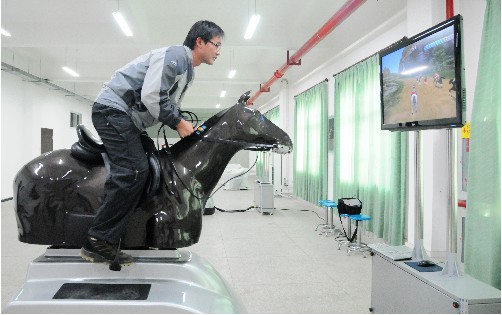 楚天都市报讯 (通讯员李芳睿 尚亚慧 记者徐啸寒)“上马、坐直、夹紧马肚、拉住缰绳,身子随着马的前行而起伏,跨栏、跳跃。”教练在一旁提醒,欢快的音乐声中,学生信马由缰,纵横驰骋(如图)。这不是在大草原,也不是在赛马场上,而是在大学教室里。昨日,武汉商业服务学院耗资百万元,从韩国购进内地首批电子模拟马,部分学生抢先尝鲜后大呼过瘾。