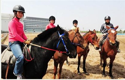 这5位大学生分别是董敏、孙自燕、杨念念、张瑞瑞和付春琴。昨日,记者在东方马城赛马场上看到,她们正在练马师的指导下紧张地训练着,她们的女骑师梦正一点点变为现实。