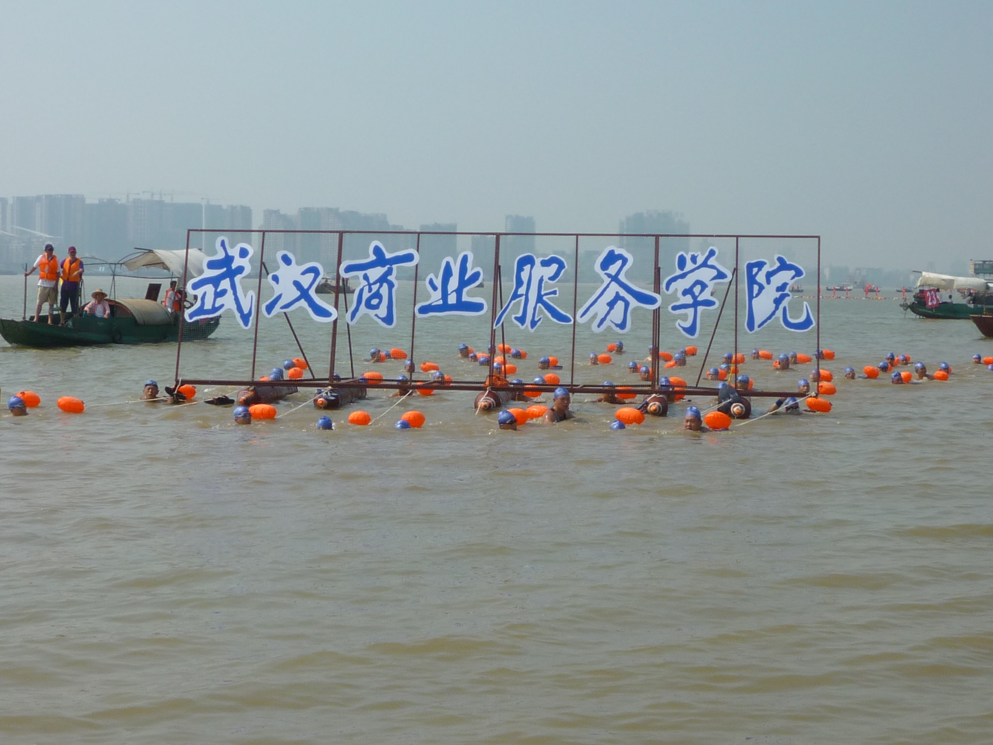 今天的长江两岸,彩旗飘飘,人头涌动,横渡长江作为我市一项历史久远的运动项目,吸引了不少观众前来观看。宽阔的江面,我校方阵的“武汉商业服务学院”几个字十分显眼。