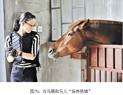 马对3人来说,既承载着她们各自的梦想,也让她们受了不少罪。背着墙面,双膝屈蹲90度扎马步,是练习马术的基本功,这可苦了没什么体育基础的3名女生,李想说:“每次扎完马步,大腿就不像是自己的,走路都不由自主。”而清扫马厩、喂马则是她们每天必干的“家务活”。在苍蝇横飞,弥漫饲料和马粪混合味道的马厩牵马、喂食,难受程度可想而知,而且,为了和马培养感情,光干这些苦活还不够,还得“拍马屁”。“我时不时买些苹果、胡萝卜等水果,给我的马‘加餐’,贿赂贿赂它,以防在上马术课时,它时不时对我来几下‘下马威’。”叶润芳说。