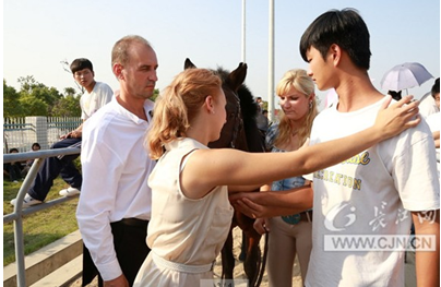 一名大一的女生初次接触马,她的手接近马的脸颊时有些发抖。匈牙利女骑士说:“不要害怕,马也能感受到人的心境,你的害怕会引起它的恐慌。”女生放松了神情,轻轻摸着马,马儿果然很温驯。