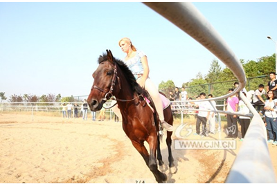 两位女骑士还现场展示了骑术。她们利落地纵身跃上马背,握紧缰绳,奔驰在马场上。随着口中向马发出各种号令,马儿有节奏地变动着步伐,时快时慢,卧倒、起身......丝毫看不去她们也是刚刚与学校马房的马才“相识”的,其驯马技艺受到中国大学生的啧啧称赞。