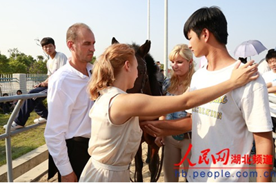 “手慢慢地、轻轻地抚摸马的脸,再摸上马儿的鬃毛、脖子,以示友好”。10月9日下午,来自匈牙利的年轻女骑士在武汉商学院训马场,给该校赛马专业的学生现场传授驯马“秘方”,让学生感受如何与马建立感情。
