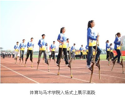 各院系运动员入场时进行了风采展示。体育与马术学院玩起民族运动,以“踩高跷、三人两足”的形式入场;开幕式上,有“东方迪斯科”之称的土家族摆手舞成为其中一大亮点。由我院62名学生表演的摆手舞柔美而不失铿锵,吸引了在场所有人的目光。他们的手臂时而“单摆”、“双摆”、“回旋摆”,时而顺拐、颤动、下屈,动作形似做农事时的“挖土”、“撒种”、“纺棉花”、“织布”、“插秧”等。双手上举、面朝蓝天,舞蹈结束动作表现了劳动人民“返璞归真、回归自然”的思想。他们曾在第九届教职工运动会上表演摆手舞,受到好评。