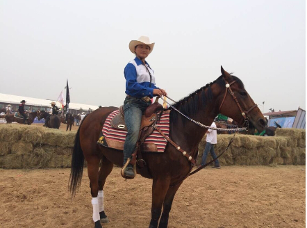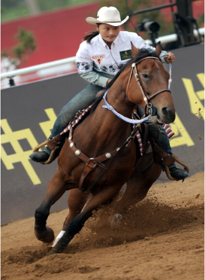 本网讯 白色外套、深蓝牛仔裤,头戴宽檐儿的牛仔帽,骑着棕色的骏马在场地中飞驰回转,6月15日,在山东青岛举行的“全国马术牧人竞技绕桶冠军赛”暨“IBHF世界杯选拔赛”上,武汉商学院2014届祝小兰与她的赛马“颐和如意”,夺得了女子组总积分第一名,并取地了参加“IBHF世界杯决赛”的资格。