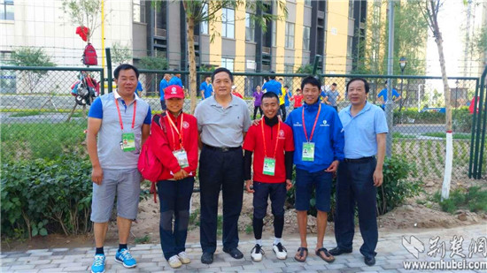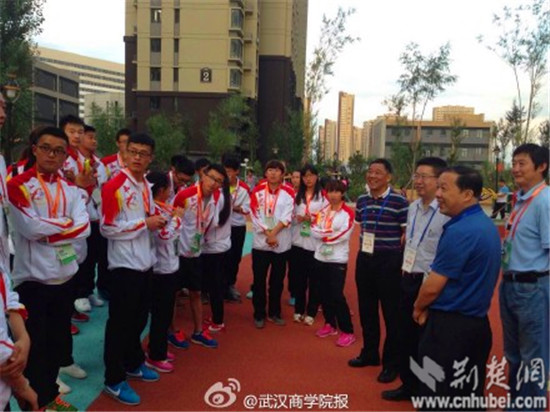 图为:武汉商学院党委书记靳雁看望运动员、教练员