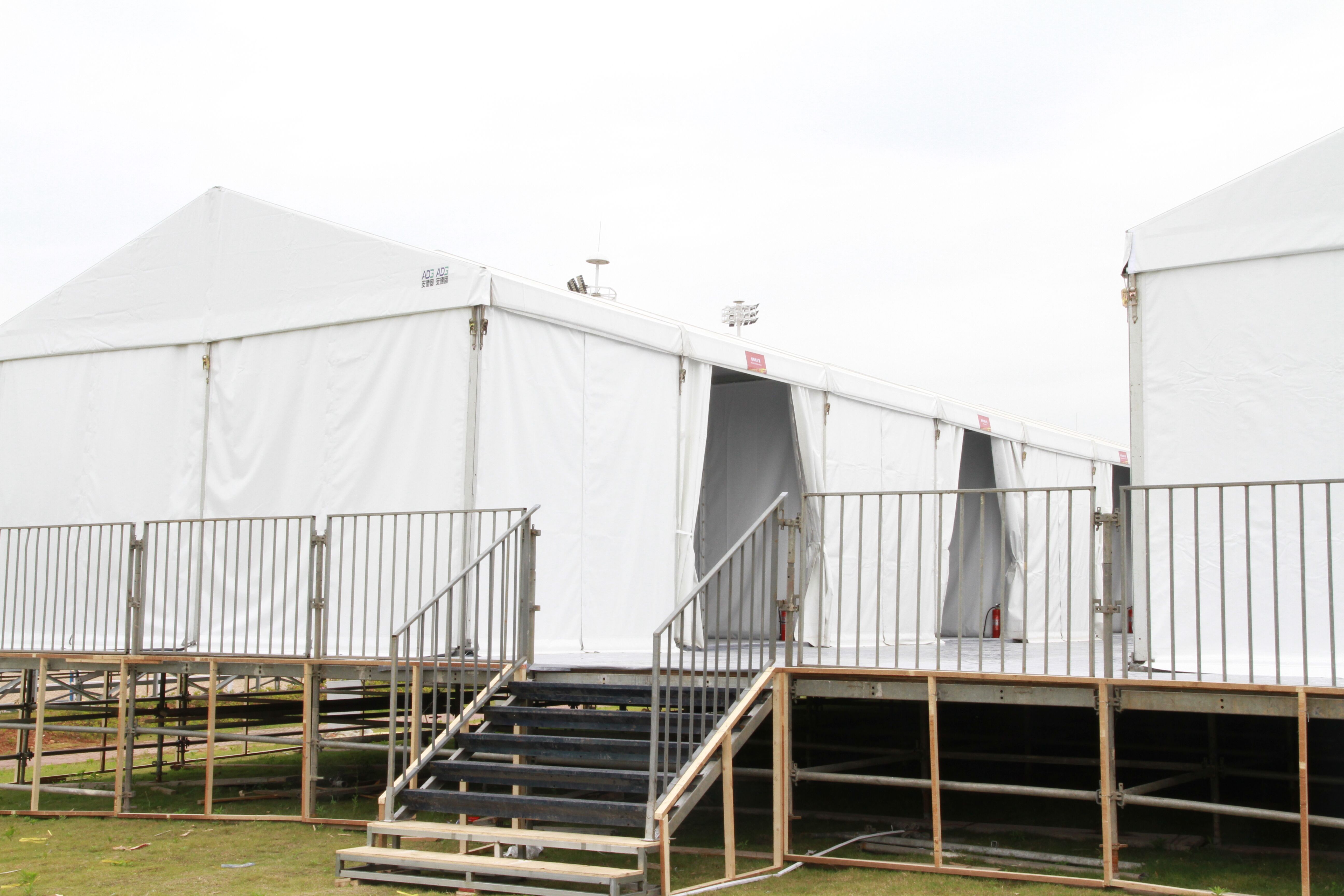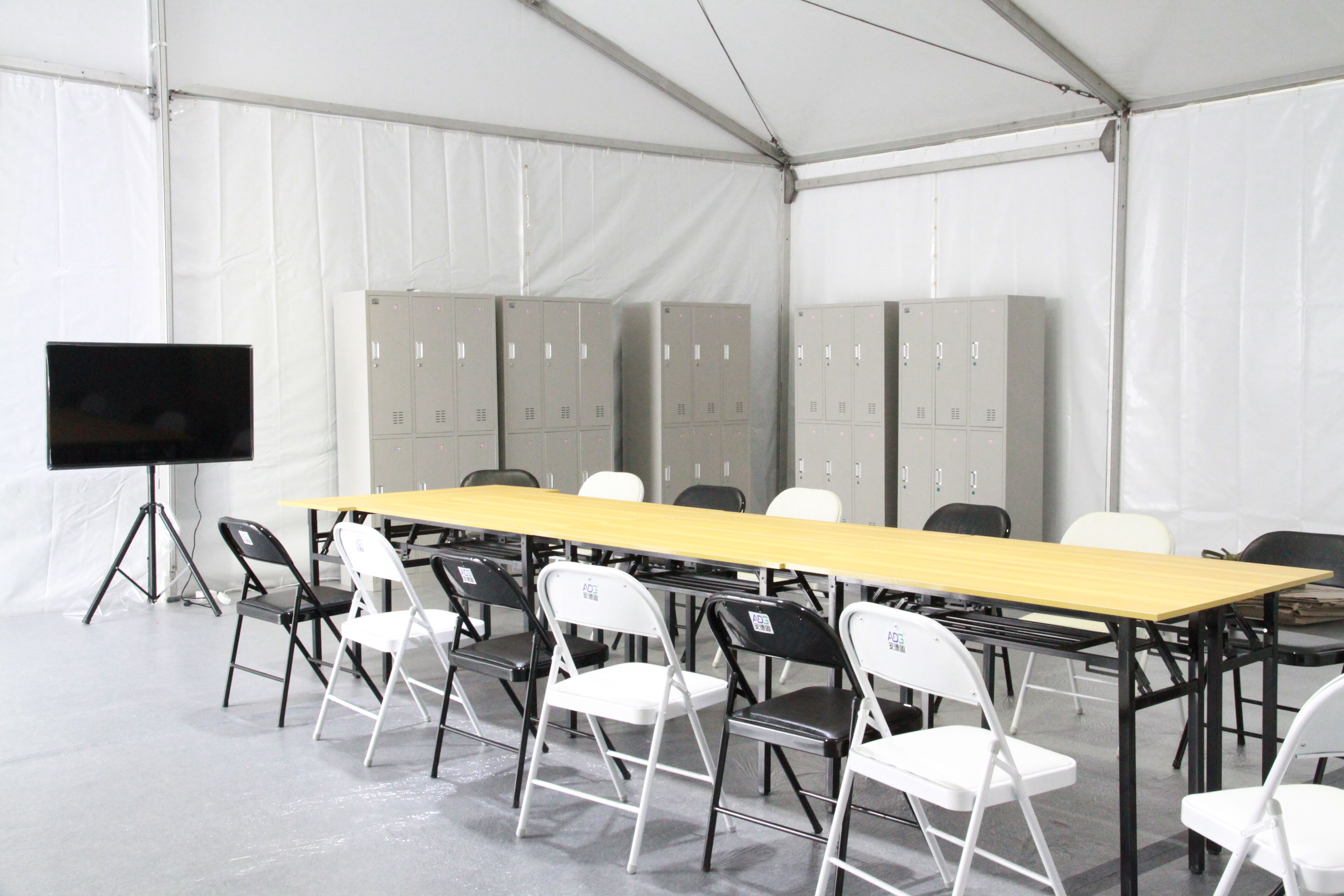 在驭马体育公园里,为了迎接国内多家俱乐部的100余匹比赛用马入住,临时马房已经全部搭建完成,率先到来的俱乐部马匹已完成安置。据久久精品亚洲·国际马术学院院长夏云建介绍,临时马房内配套设施完善,除了分隔成单间的“小马房”以外,还有可同时容纳十余匹马同时淋浴。在现场,记者看到测试赛的“转换枢纽”——篷房,一应俱全,内设媒体工作室、器材室、颁奖·体育展示室、赛事监管办公室、裁判员办公室、成绩统计室、医务室等不同功能。篷房紧邻着测试赛马术比赛场地,除了专业的场地铺设外,共有三排观众席,围绕场地而设。据了解,比赛当天,场地同时备好了太阳帽和雨具,确保现场观赛效果。