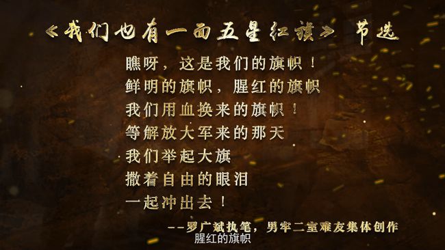 “好!”大家纷纷表示赞成。那时大家不知五星红旗究竟是什么样,罗广斌拿出自己的红色绣花被面,和大家轻声商议。后来罗广斌的诗歌《我们也有一面五星红旗》再现了当时的制作过程:我们有床红色的绣花被面,把花拆掉吧,这里有剪刀。拿黄纸剪成五颗明亮的星,贴在角上……