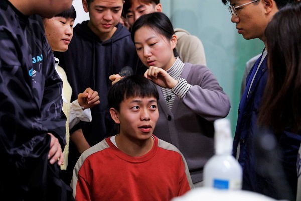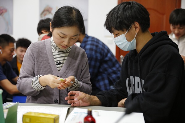 李怡运用直透刺法、斜透刺法、平刺透穴法的原理分别用一寸、三寸、一至一点五寸的针灸针为体验者扎手臂、腿部以及头部百会穴的穴位。同学们纷纷围上前观看,尤其对头部腧穴刺法感到好奇。“头部血管丰富、马囊众多,要掌握好针刺角度、方向和深度。”李怡捻转着针灸针,将其上下移动。学生胡彩虹对针灸课很感兴趣,她表示每周一节的针灸课能让自己学到很多知识,针灸具有疏通经络调和阴阳的作用,自己原先略有些酸痛的小腿经过老师的针灸疗法后改善了许多。