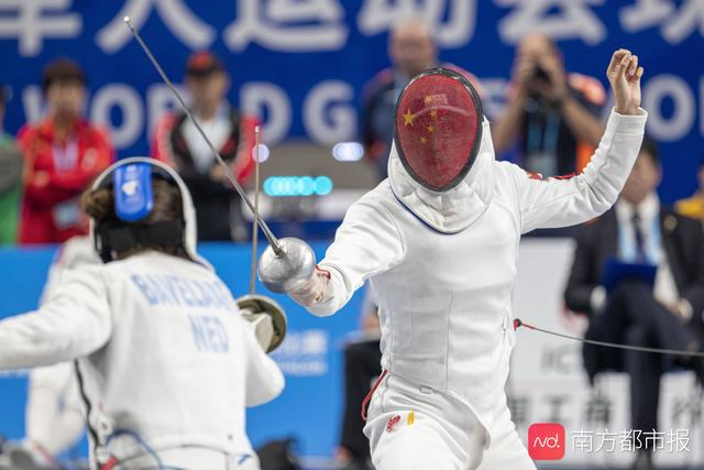 佩戴五星红旗图案头盔面罩的中国选手在击剑比赛中。上午9点30分,现代五项开始击剑项目比赛,该项目中36名运动员需要经过17轮大循环赛和1场高台擂台赛。整个比赛持续了3个多小时,是几个项目中耗时最久的项目。南都记者 黎湛均 摄