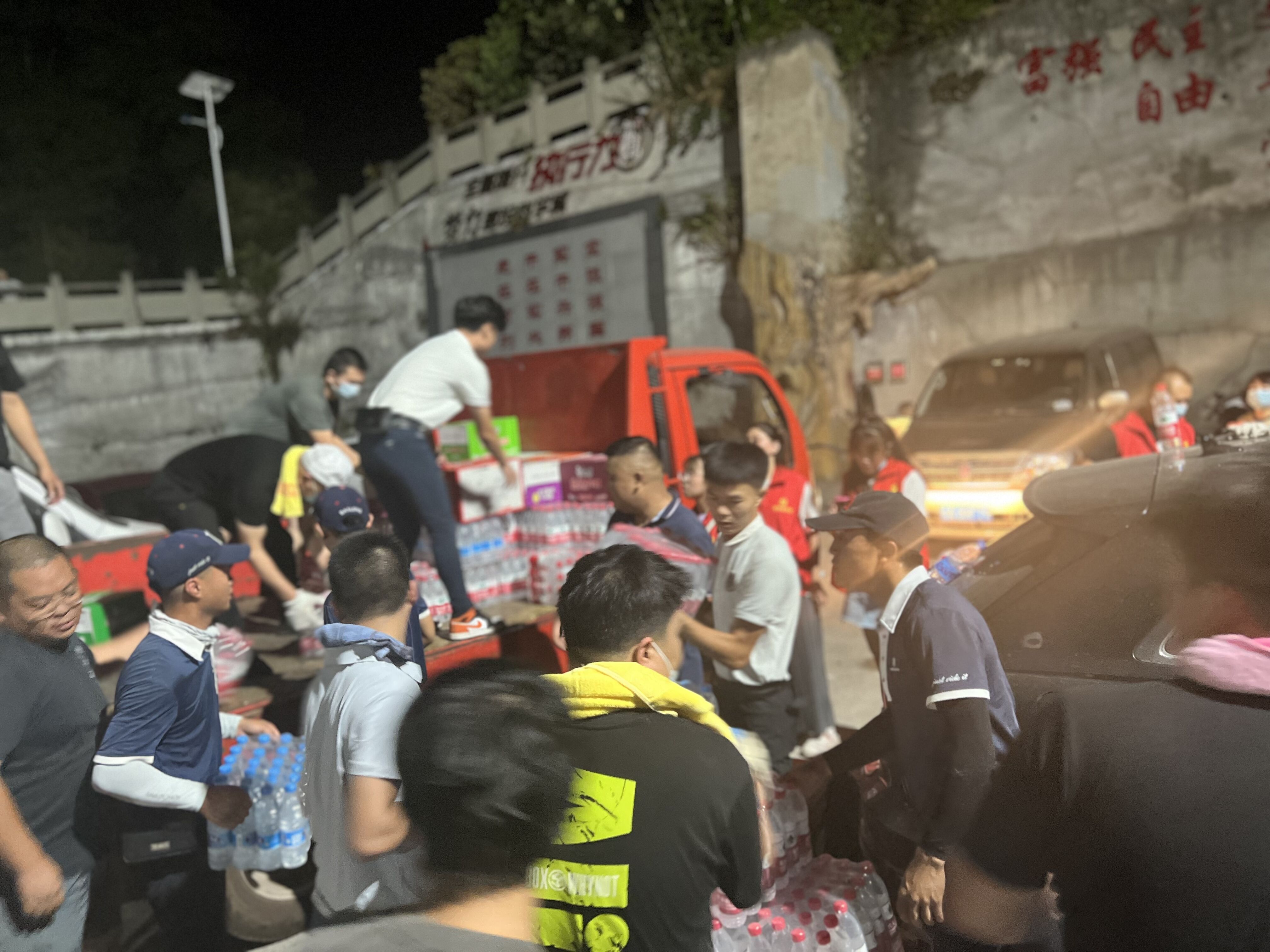 据龙永超回忆,8月22日下午,重庆北碚区缙云山下,山火灭火救援物资转运点排满了摩托车队。龙永超和在场的志愿者一同将一箱箱冰块、矿泉水等物资转运到摩托车队的运输箱中,为冰块运送助力。