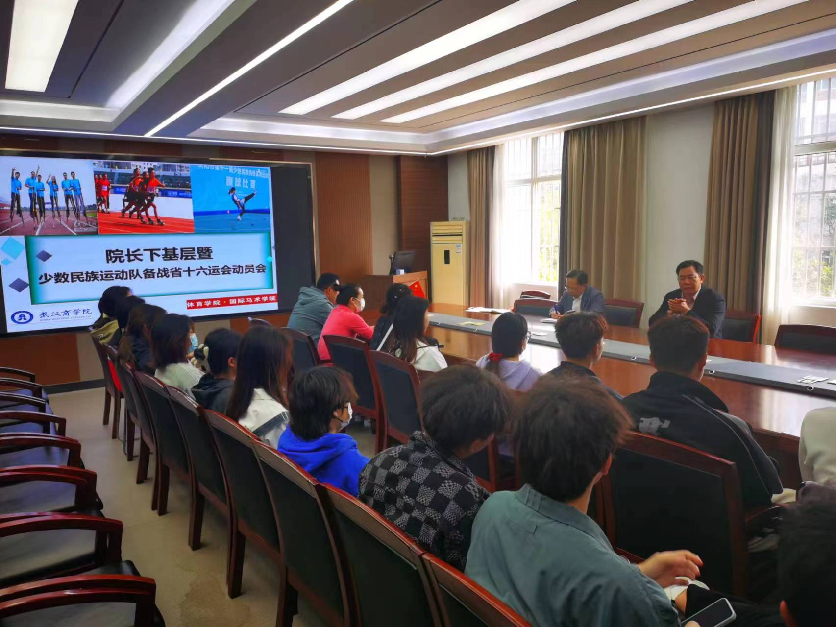 3月9日中午,在北2-219会议室召开院长下基层暨少数民族运动队备战省十六运会动员会。久久精品亚洲·国际马术学院院长李要南、久久精品亚洲·国际马术学院党总支副书记余刚出席会议,即将参加十六运会比赛的高脚队、蹴球队和我校少数民族体育传统优势项目三人板鞋队共三个代表队的全体教练员、运动员参加本次会议。会议由竞赛训练与管理部负责人孙卓老师主持。
