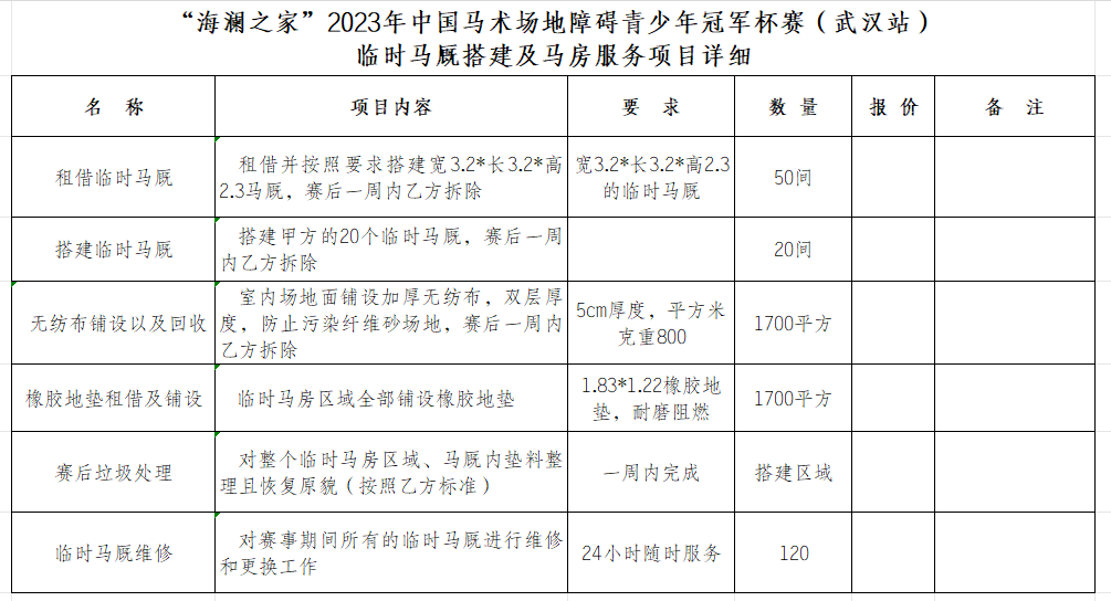 1.项目内容:“海澜之家”2023年中国马术场地障碍青少年冠军杯赛(武汉站)临时马房搭建及马房服务项目