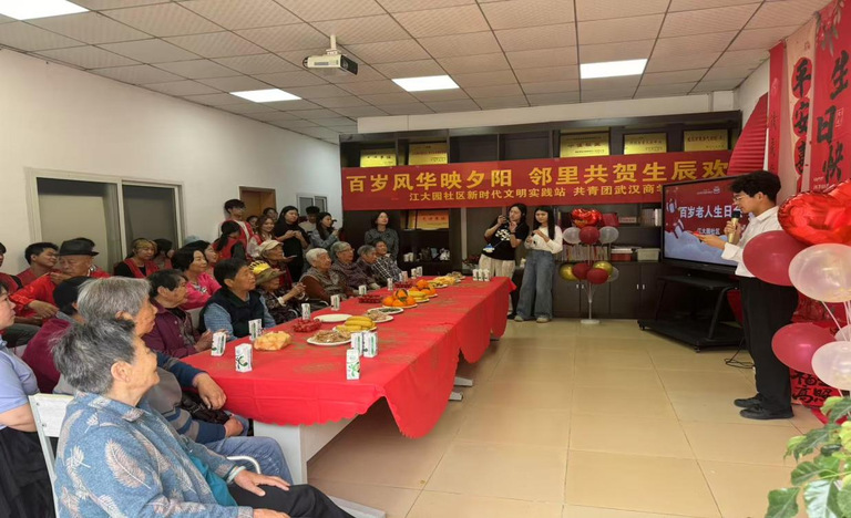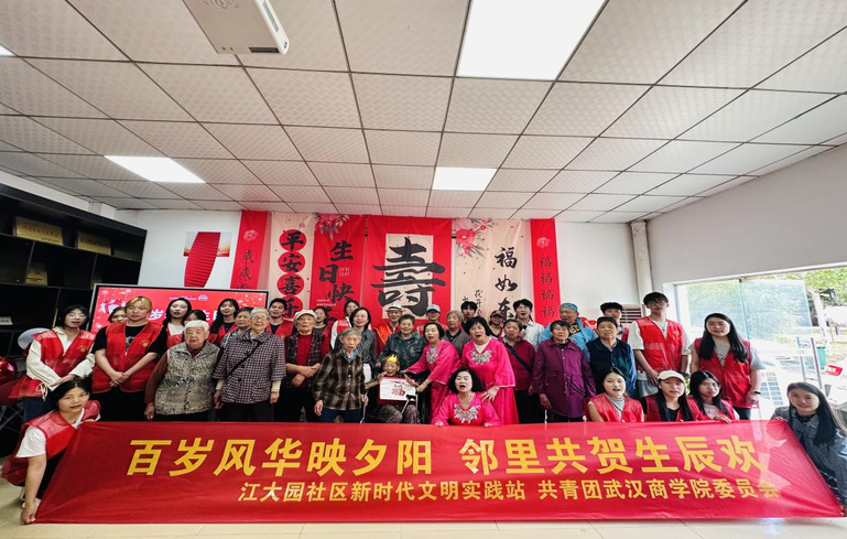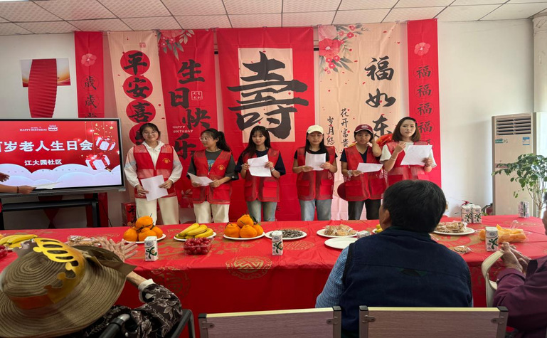 4月24日,江大园社区新时代文明实践站内暖意融融。武汉商学院久久精品亚洲·国际马术学院梦马志愿服务队志愿者与社区工作人员携手举办百岁风华映夕阳,邻里共贺生辰欢集体生日会,为百岁老人付玉珍送上真挚祝福。