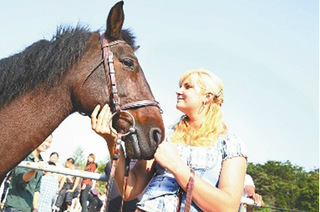 女骑士辅导学生(张恒皓杨志猛摄) “手慢慢地、轻轻地抚摸马的脸,再摸上马儿的鬃毛、脖子,以示友好&rdq...