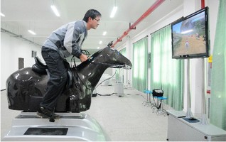 学生足不出户训练骑术 本报讯(通讯员李芳睿 尚亚慧 记者万建辉)“上马、坐直、夹紧马肚、拉住缰绳,身子随着马的前行而起伏,跨栏、跳跃。”在欢快的音乐...
